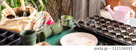 Garden enthusiast prepares to plant tomato seeds in seedling trays at home, surrounded by gardening supplies and sunlight streaming through the window, banner