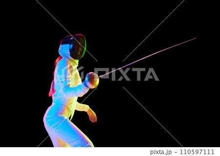 Female fencer, athlete in full uniform training, competing, practicing over black background in neon light