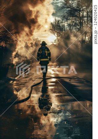 Brave firefighter walks through smoke and reflections at sunset after battling a fire on a city street