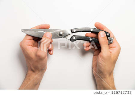 worker holds a pruner with black handles on a white background, close-up. garden tools