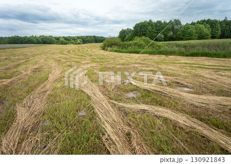 A mown meadow bordered by a forest under a cloudy sky