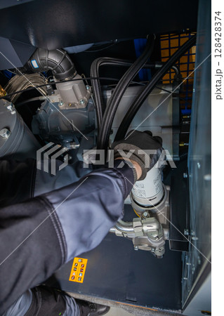 Technician replacing oil filter in industrial compressor, maintenance procedure