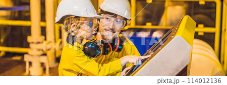 BANNER, LONG FORMAT A young man and a little boy are both in a yellow work uniform, glasses, and helmet in an industrial environment, oil Platform or liquefied gas plant looking at a screen