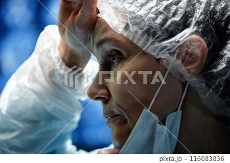 Dramatic side view closeup of exhausted surgeon rubbing sweat of forehead while performing surgery in operating room copy space