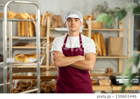 Confident dedicated young bakery worker standing with crossed arms