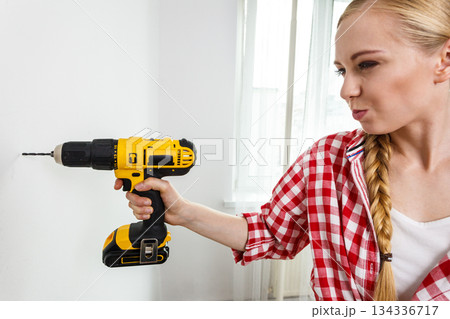 Woman using drill on wall