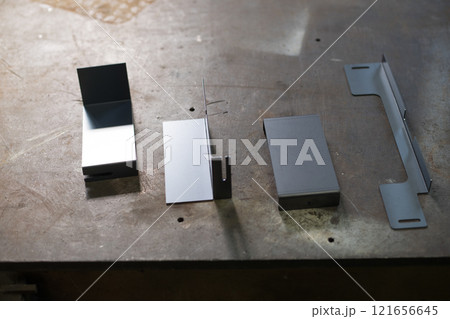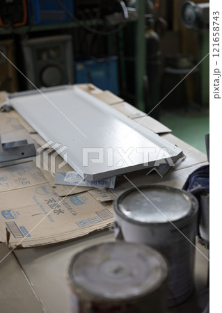 Large stacks of rusty metal pipes are stored inside vast industrial warehouse or factory. Organized rows of various sized pipes fill foreground, highlighting scale of heavy industry, manufacturing