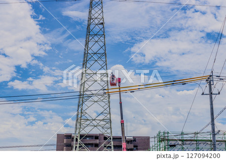 高所作業車に乗って高圧鉄塔の近くで働く男性