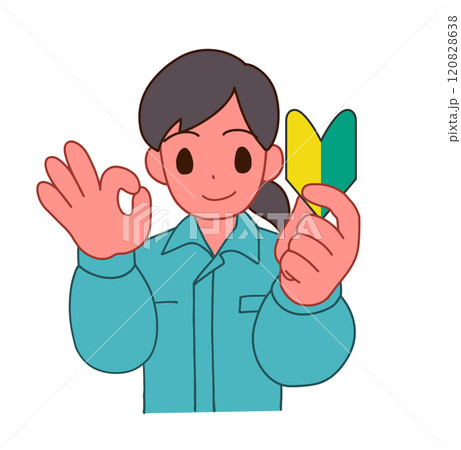 作業服を着た初心者マークを持ちOKサインをしている笑顔のデフォルメ女性のイラスト
