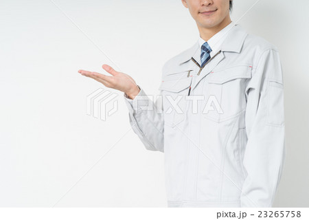作業着 男性 ネクタイ ガッツポーズ 左手