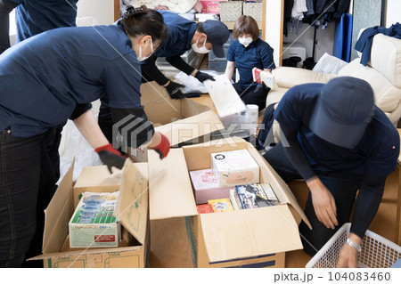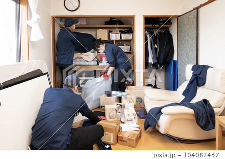 押入れの片付けをする4人の作業員