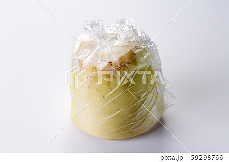 家のキッチンでキャベツにラップをするミドル〜シニア女性