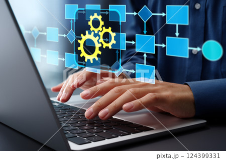 ビジネスワークフローオートメーション。フローチャートと歯車のアイコン。ノートパソコンで自動化システム