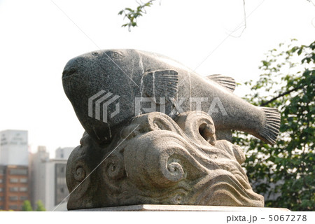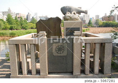 松江市の松江大橋南詰(源助公園)にある源助柱記念碑・深田技師殉難記念碑(背後に松江大橋)