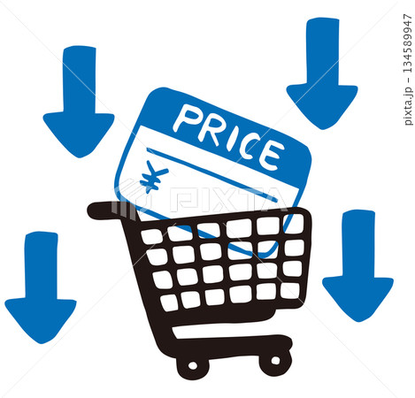 値札入り買い物かごと下向き矢印のベクターイラスト|物価低・値下げ・価格下落素材