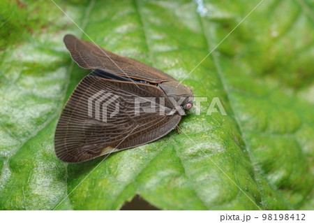 生き物 昆虫 チュウゴクアミガサハゴロモ、成虫です。光沢のあるこげ茶色の翅、翅の縁に淡色の斑紋