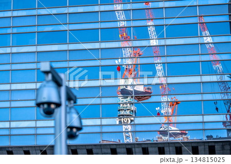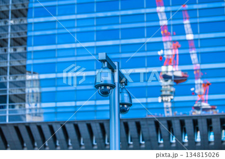 日本の東京都市景観TOKYO TORCH。東京駅(日本橋口)付近の防犯カメラと窓に映る大手町再開発