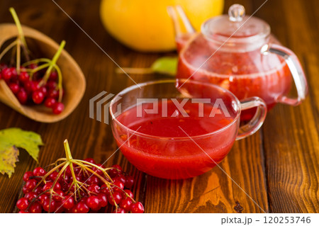tea from ripe red viburnum on a wooden table