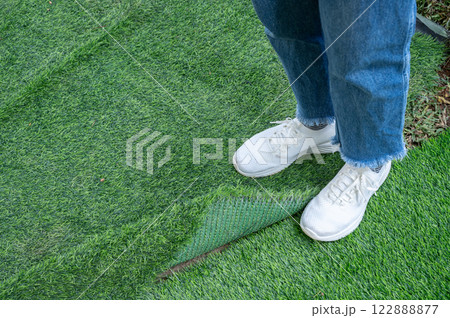 Cropped shot view of someone standing on incomplete green artificial turf. Artificial grass are made by polyethylene or nylon, convenient and it does not require much maintenance.