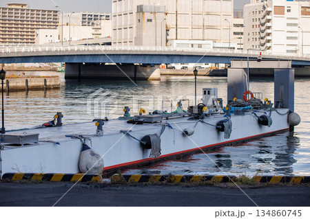 都市部の運河に係留された作業用台船と背景の橋