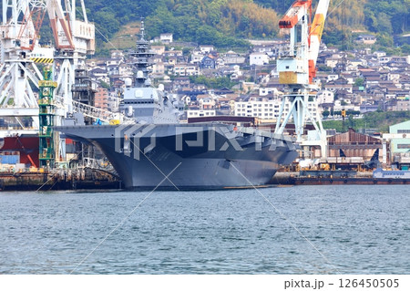 【広島県】晴天の海上自衛隊 呉基地に停泊する大型護衛艦 かが