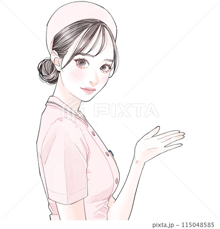 案内をするエプロンを着用した女性-4色