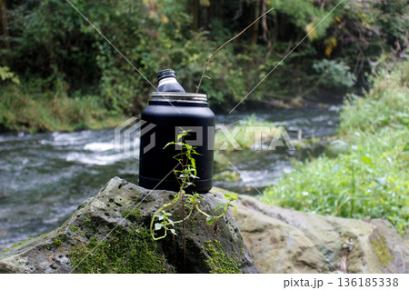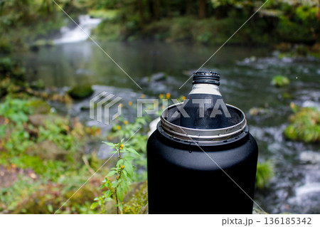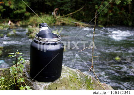 キャンプ用アイスジャグで冷やす缶(静岡県芝川の清流)
