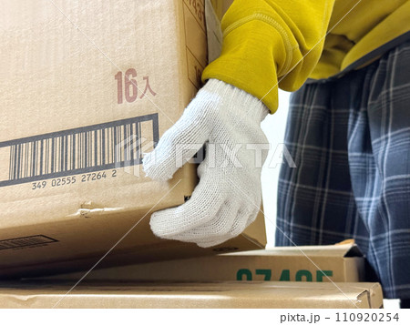 賞味期限の文字入り段ボール箱を持ち上げようとしている軍手の人