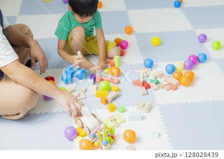 Small child's big curiosity. Building a playful preschooler. Infant's daycare adventures. Cute wavy haired blonde infant baby playing wooden educational toys at home interior.
