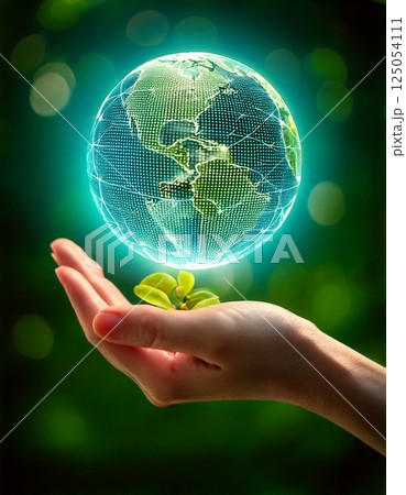 A person holds a miniature planet filled with vibrant vegetation in their hands outdoors
