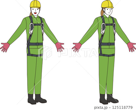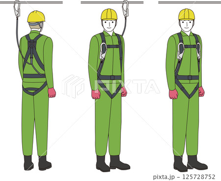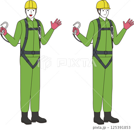 高所作業に備え安全対策として保護具(フルハーネス)を装着する作業員 建設労働者のイラストセット