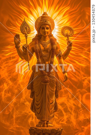 Golden statue of lord Murugan, the Hindu god of war and victory, standing against a vibrant, fiery orange background