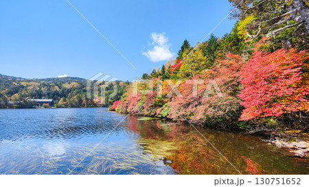 日本 長野県北佐久郡立科町にある白樺湖と新緑に囲まれた湖畔の風景