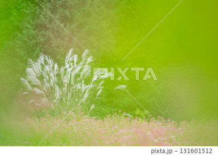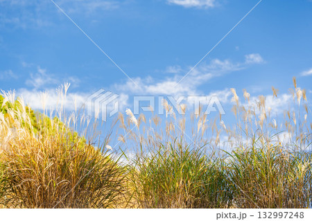 晩秋の夕暮れ時のススキと紅葉 いずみ湖