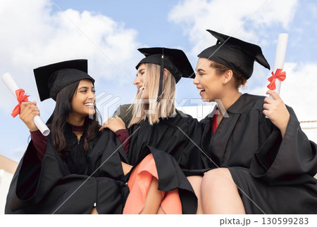 Graduation, education and group of friends celebrate success on sky background. Happy women, diversity students and graduates in celebration of study goals, award and smile with college certificate