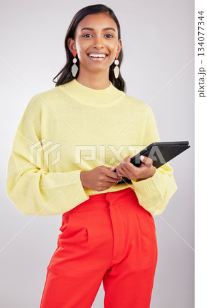 Happy, work and portrait of a woman with a tablet isolated on a white background in a studio. Smile, business and a young girl with technology for social media, email or internet access on a backdrop