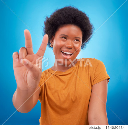 Peace sign closeup, black woman hand and happiness with a young female smile. Isolated, blue background and v hands gesture of a happy African model with a afro and beauty feeling cool and fun