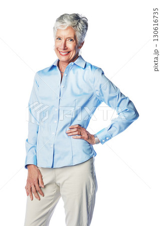 Smile, confidence and portrait of senior woman with happiness isolated on white background. Arms crossed and wrinkles, happy woman with joy and pride in retirement fashion in studio with mockup.