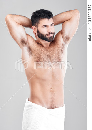 Skincare, towel and man with cosmetics, thinking and natural beauty on grey studio background. Male, guy and hygiene for confidence, morning routine and grooming for treatment, luxury and dermatology