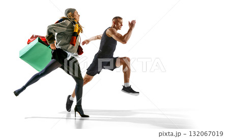 Collage art. Runner and woman with shopping bags sprinting together in energetic retail motion