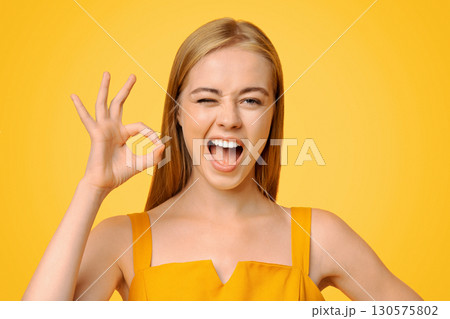 Everything is Great. Beautiful Young Girl Winking And Showing Ok Sign, Standing Over Yellow Background With Copy Space