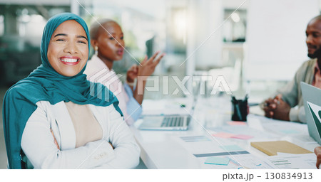 Portrait, meeting and Islamic woman with arms crossed, business and cooperation with brainstorming. Face, African person and happy manager with employees, professional and smile with ideas or project