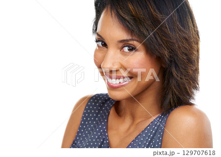 Smile, beauty and portrait of black woman on a white background for wellness, cosmetics and makeup. Skincare, natural lifestyle and face headshot of girl with big smile, confident and happy in studio