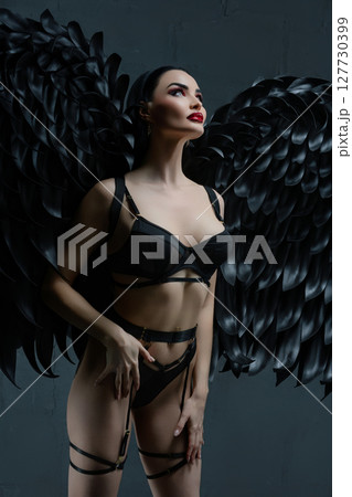 Beauty exudes confidence in lingerie with striking black wings