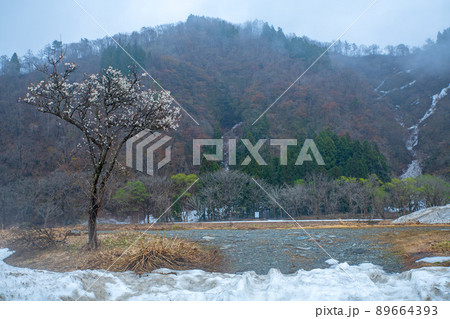 雪どけの魚野川河川敷 梅花 関越自動車道湯沢IC付近 残雪 早春の風景