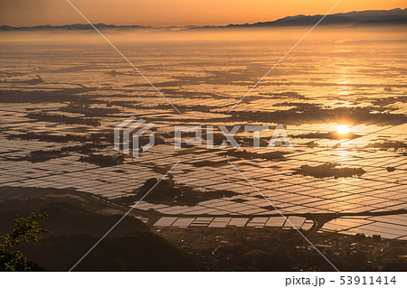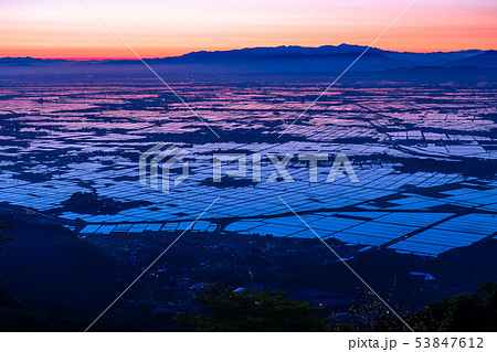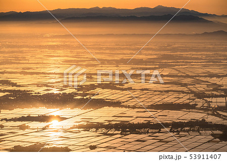 《新潟県》越後平野の夜明け・水鏡の田園風景
