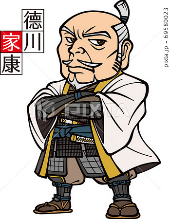 陣羽織をまとって腕組みをする徳川家康 【3頭身・老人・家紋】