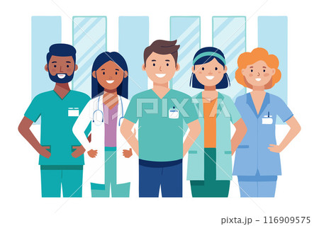 Diverse group of healthcare professionals smiling together in a hospital setting