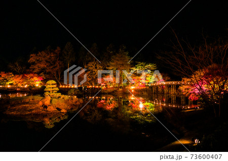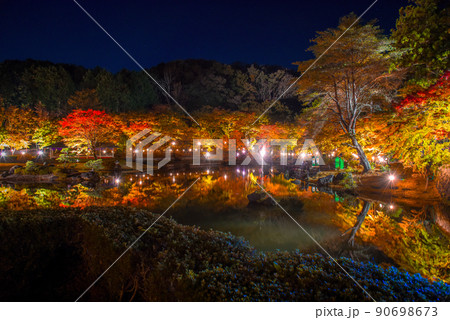 修善寺虹の里 池に映る夜の紅葉ライトアップ