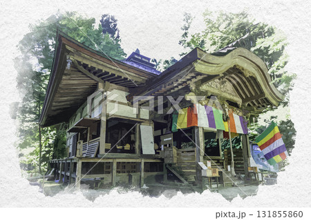 水彩画風 三徳山三佛寺 輪光院 本堂 鳥取県三朝町